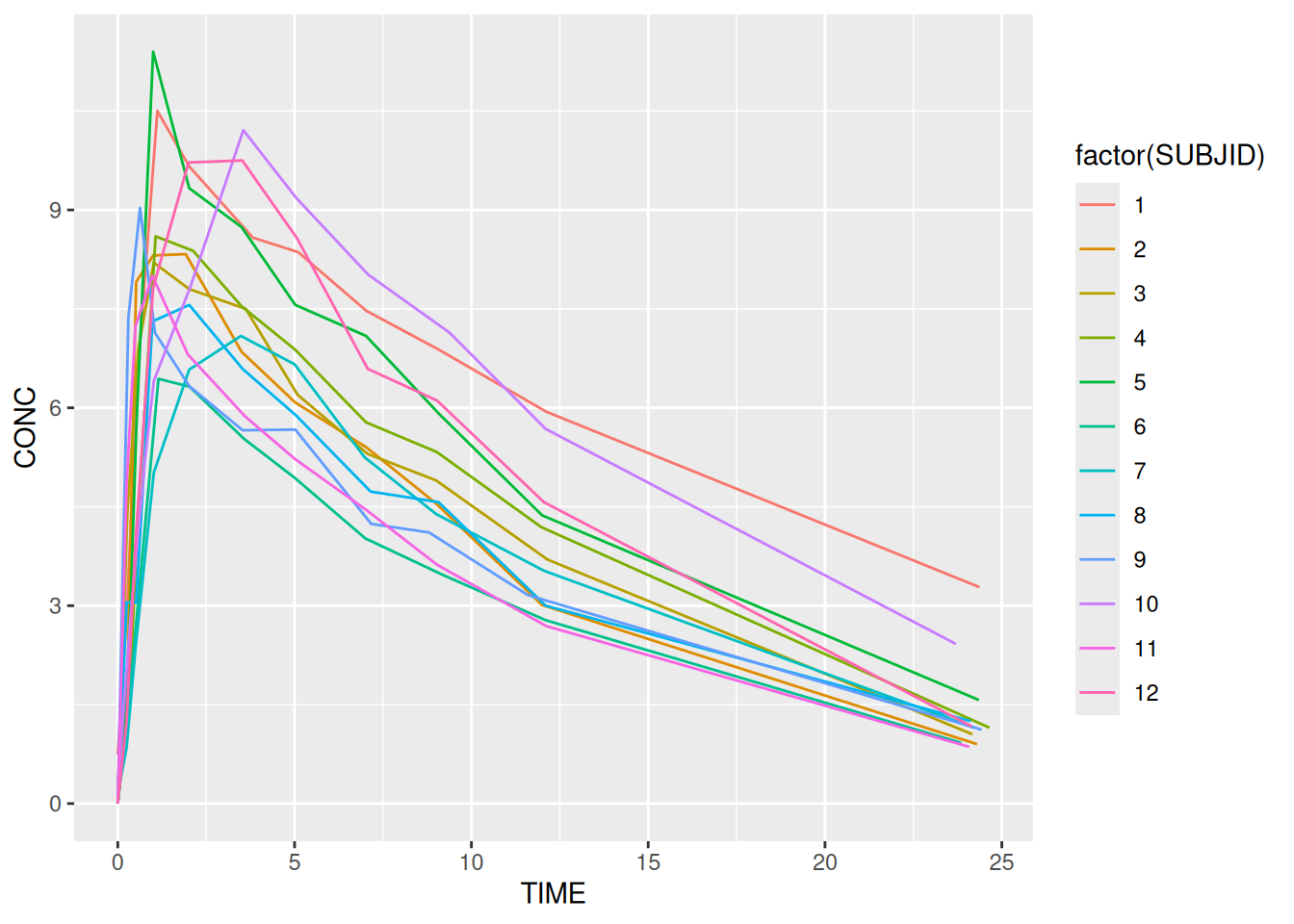 Note the use of factor. This turns SUBJID from a continuous into a categorical variable. It is required to ensure that we get a distinct colour for each, instead of gradation. It also ensures that each subject is plotted as a different line.