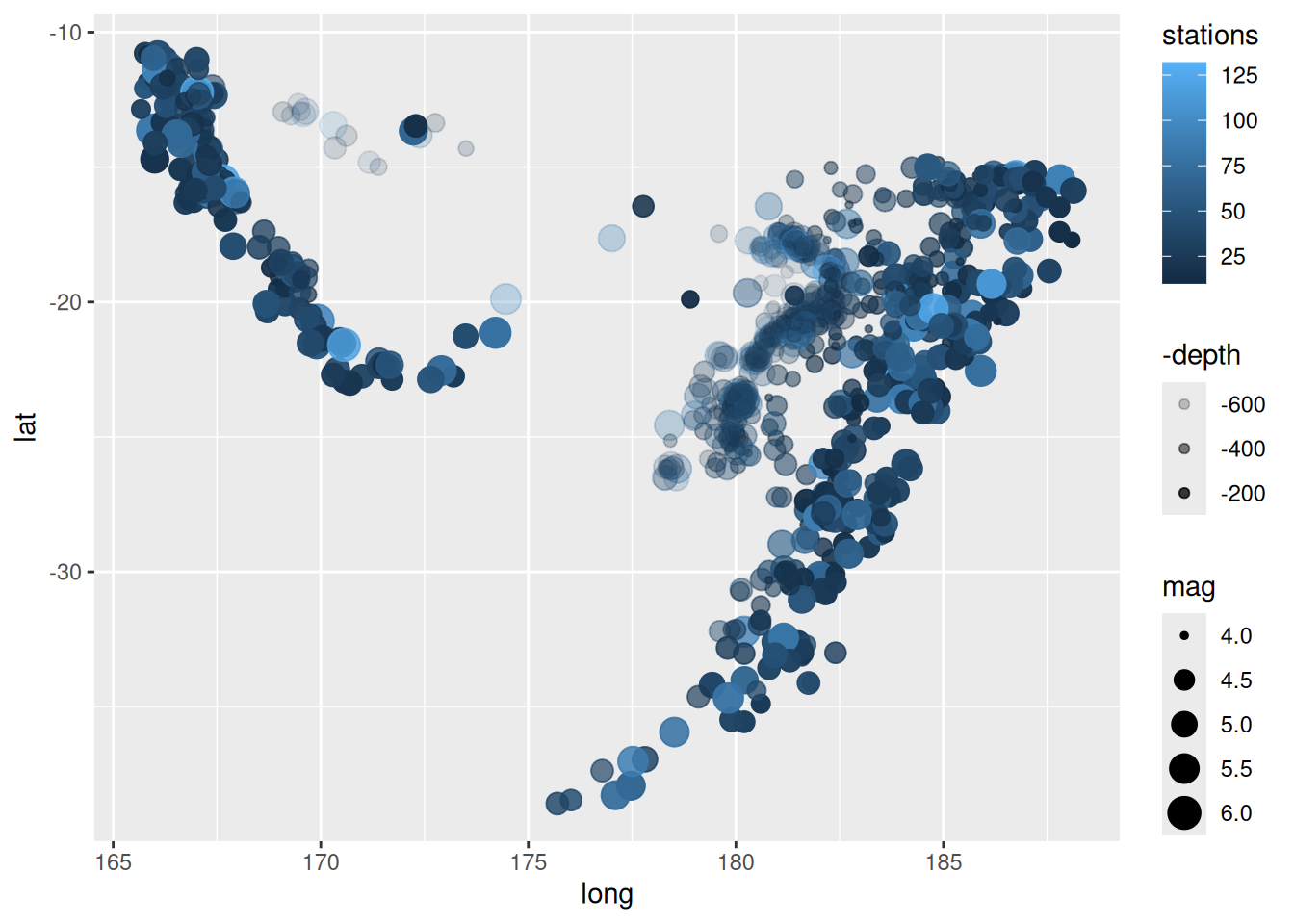 aes(x = long, y = lat, alpha = -depth, colour = stations, size = mag)) +