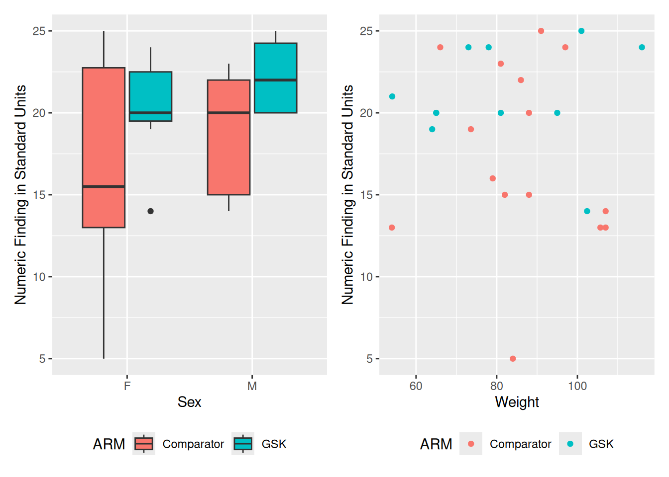 # Create two plotsact_bl <- act_full |>filter(VISITNUM ==40)base_info <-ggplot(data = act_bl, aes(y = ACTTOT)) +theme(legend.position ="bottom")plot1 <- base_info +geom_boxplot(aes(x = SEX, fill = ARM)) +labs(fill ="ARM") # Modify legend labelplot2 <- base_info +geom_point(aes(x = WEIGHT, colour = ARM)) +labs(colour ="ARM") # Modify legend label# Arrange side by side using patchwork syntaxlibrary(patchwork)# The '|' operator places plots side-by-sideplot1 | plot2