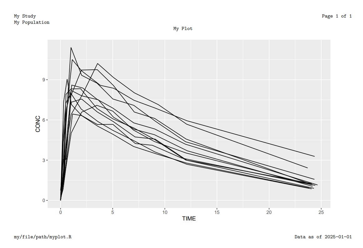 # Load packagelibrary(docorator) # Create figuremyplot <-ggplot(data = theoph, aes(x = TIME, y = CONC, group = SUBJID)) +geom_line()# Export display myplot |>as_docorator( display_name ="myplot",display_loc ="my/file/path",header =fancyhead(fancyrow(left ="My Study", center =NA, right =doc_pagenum()),fancyrow(left ="My Population", center =NA, right =NA),fancyrow(left =NA, center ="My Plot", right =NA) ),footer =fancyfoot(fancyrow(left =doc_path(display_name, display_loc), center =NA, right ="Data as of 2025-01-01") ) ) |>render_pdf()